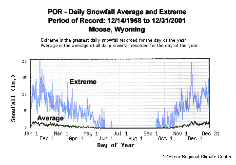 WRCC's graph, "POR – Daily Snowfall Average and Extreme" (Figure 2) shows the extreme snowfall values plotted for the entire 43-year period. When WRCC "Period of Record Daily Climate Summary" is analyzed for snowfall extremes, every calendar year is represented in the extreme snowfall graph plot in Figure 2.