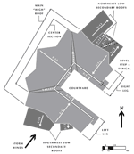 As previously described, the main shed roof is U-shaped and each side slopes down toward the center courtyard. The left (southwest) leg slopes northeast, and is on the lee side of the storm winds. It is also in the shade of the afternoon winter sun. The center (northwest) section of the U-shaped main roof slopes southeast. The left portion is partially in the lee while the right portion is partially to windward. It also is fully exposed to midday winter sun. The right (northeast) leg slopes southwest and is on the windward side of storm winds. This right leg receives full afternoon sun. The outer, high edge of the shed is an architecturally random sawtooth design, but the roof is still a flat plane sloping at 3:12 toward the courtyard. When the slope reaches the covered walkway, a bevel step slopes down about 23 cm (9") and continues at a 3:12 slope to the straight-line eave bordering the courtyard.