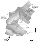 The bottom of the main roof valley at the west corner of the courtyard is estimated to have 3 M (10 ft.) of snow with at least 30% density. This translates to approximately 9.28 kN/m2 (190 lb/ft2), almost double the design snow load. Eave loading due to snow cornice cantilevers approach four times the design snow loads. At 30% density, snow depths of 1.65 M (5'4") or above exceed the design snow load of 4.93 kN/m2 (101 lb/ft2). Roof snow depths, snow density and snow cornice conditions will be at maximums. (Figure 7).