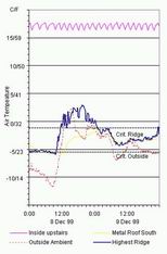 early afternoon. The condition change from a period of temperatures below freezing with snow cover on the roof to a period of higher temperatures with the impact of solar radiation on the temperatures readings for the south facing metal roof can be observed in Figure 14. At temperatures below freezing, the ribs of the metal roof hold the snow on the roof. November 12–14, 1998 is a time period of continuous air space temperatures above or around the freezing point. This situation is caused by high outside temperatures and increased heat transfer through the roof based on raised interior temperatures due to occupancy change. After a time period with enough warm air to warm up the metal roof ribs, the snow pack slides off the slippery metal roof in the after-noon of 13 November 1998. (Figure 4) From that time on the metal roof temperature exceeds the outside air temperatures due to solar radiation as shown in Figure 13.