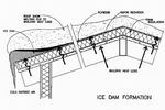 Ice dams form when the roof's snow pack melts and seeps down to the surface of the roof where the water is prevented from freezing by the snow's insulation. The meltwater runs down the roof slope, only to refreeze when it hits the cold air or the cold eaves on the downslope edge. The ice causes a blockage and results in the formation of more ice dams and icicles (Figure 8). The ice dam builds as the flow of meltwater collects behind it, floods over the top or around the sides, and refreezes when it contacts freezing air. It is not uncommon to find ice dams several feet high at roof edges holding back large quantities of meltwater. This produces great water pressure on the roof surface below.